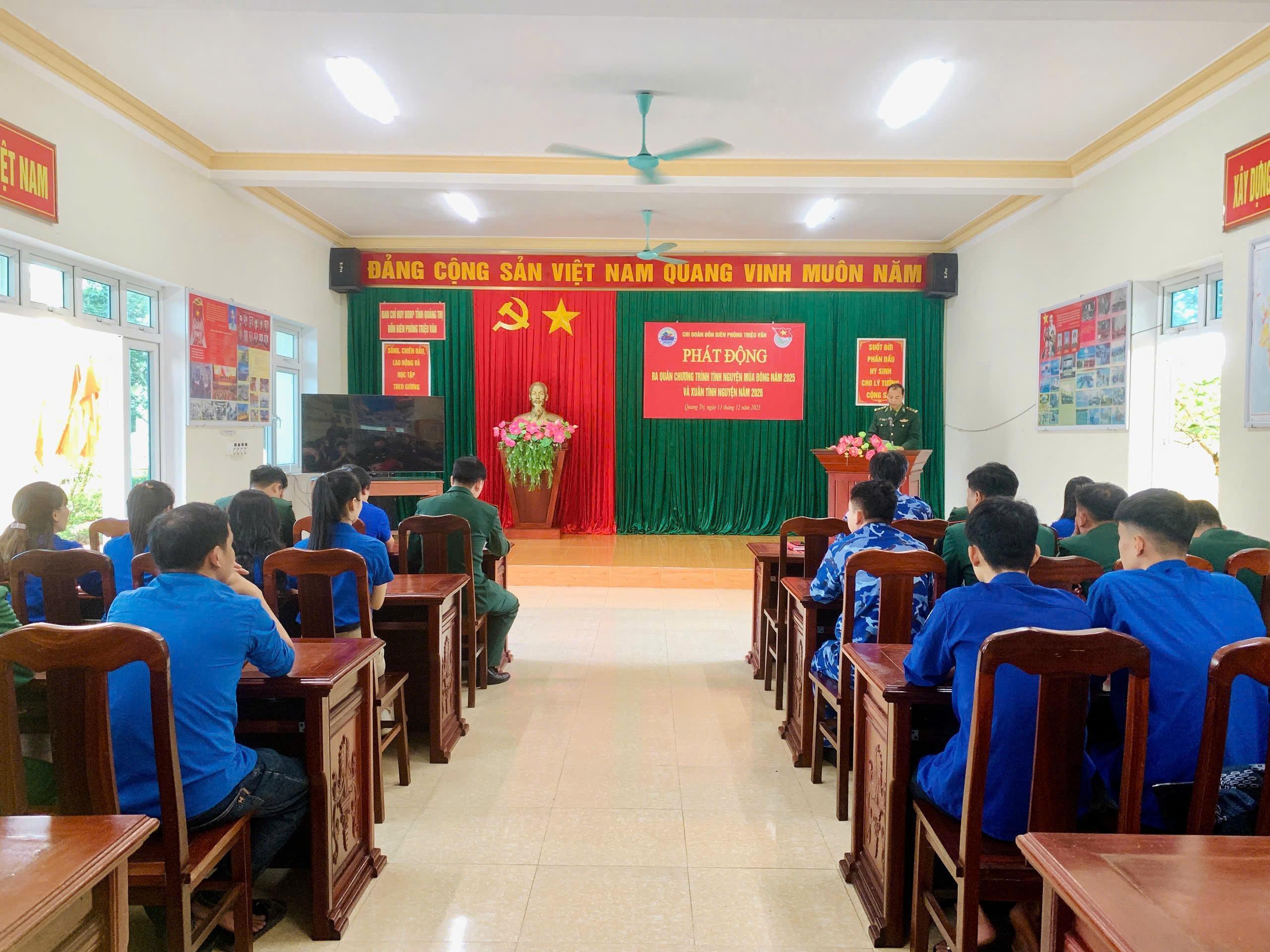 Sáng ngày 13/12/2025, tại Đồn Biên phòng Triệu Vân (Bộ đội Biên phòng tỉnh Quảng Trị), Chi đoàn Đồn Biên phòng Triệu Vân chủ trì, phối hợp với Đoàn TNCS Hồ Chí Minh xã Nam Cửa Việt và các đơn vị liên quan tổ chức Lễ phát động Chương trình “Tình nguyện mùa Đông 2025 – Xuân tình nguyện 2026”.