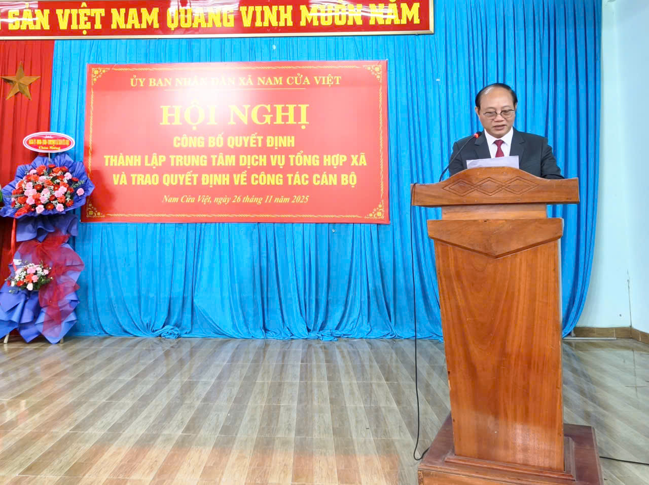 Trong khuôn khổ chương trình, Hội nghị cũng công bố các quyết định về công tác cán bộ, gồm quyết định bổ nhiệm lãnh đạo Trung tâm và quyết định thành lập Chi bộ Trung tâm Dịch vụ tổng hợp. Theo đó, UBND xã phân công đồng chí Hoàng Đức Bảo giữ chức Phó Bí thư phụ trách Chi bộ, Phó Giám đốc phụ trách Trung tâm Dịch vụ tổng hợp xã Nam Cửa Việt kể từ ngày 21/11/2025 cho đến khi UBND xã bổ nhiệm Giám đốc Trung tâm theo quy định.